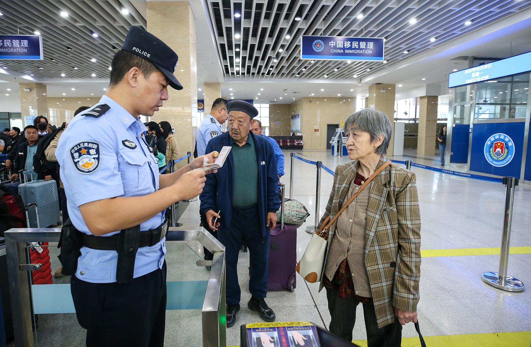 图为9月8日,二连出入境边防检查站移民管理警察为老年旅客提供通关咨询。
