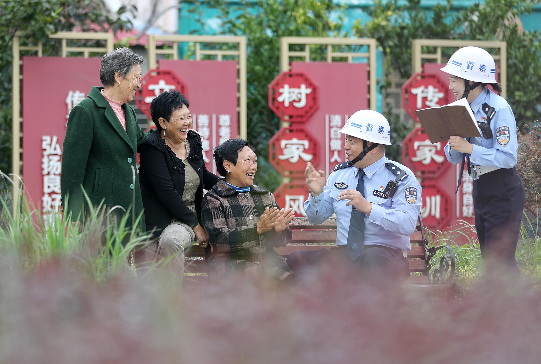 9月22日,在湖北省荆门市沙洋县三峡土家族村,沙洋县公安局督察大队民警与村民“唠家常”,倾听群众对公安服务的需求与建议。