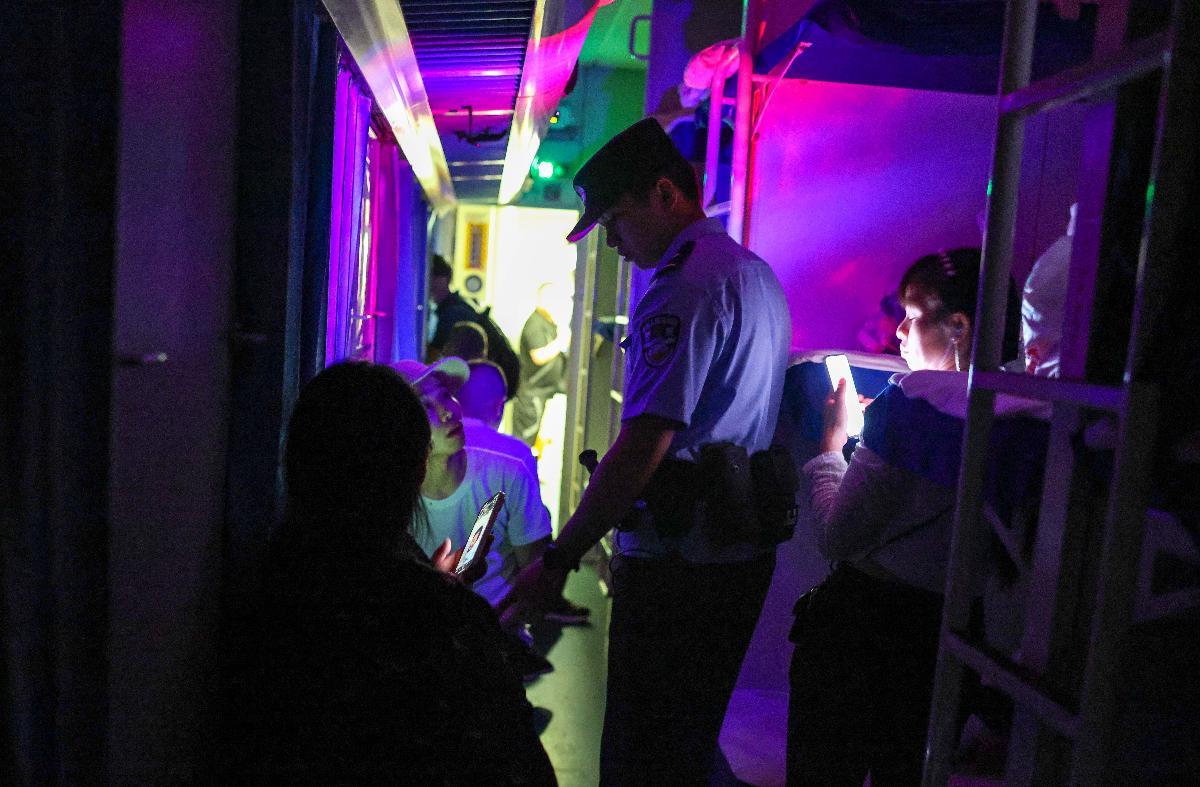 10月14日,刘涛在K845次列车卧铺车厢开展夜间巡查时提示旅客保管好贵重物品。