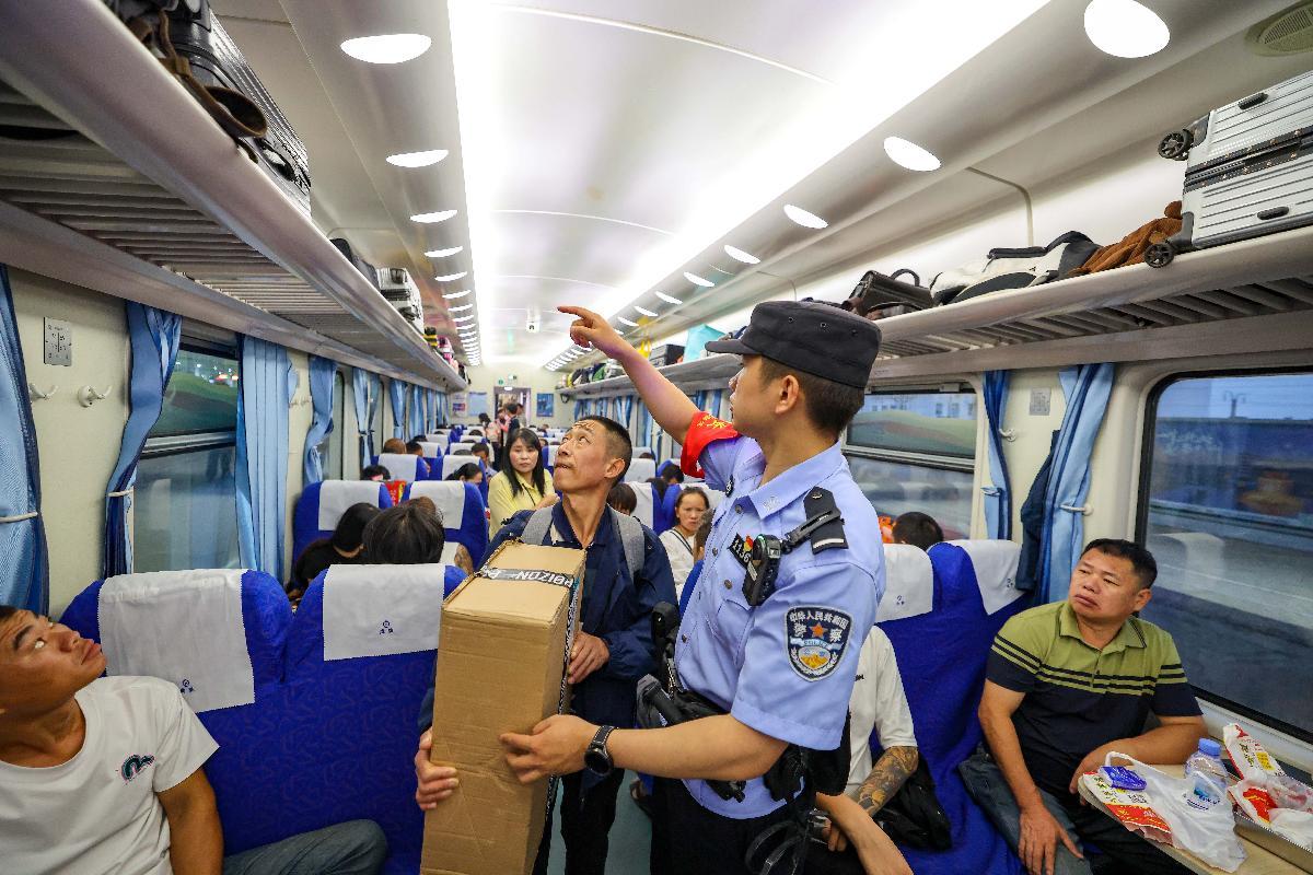 10月14日,刘涛在K845次列车上指导旅客安全摆放行李。