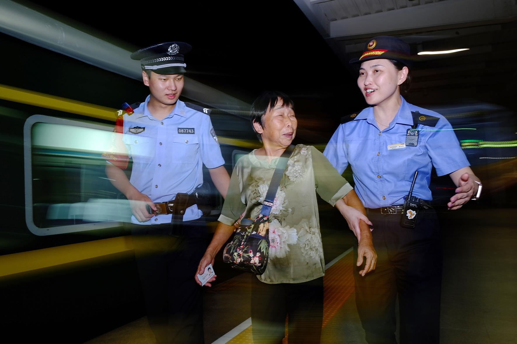 10月15日晚,杭州铁路公安处金华站派出所民警与车站员工热情帮助一位78岁、首次乘火车出行的大妈上车。