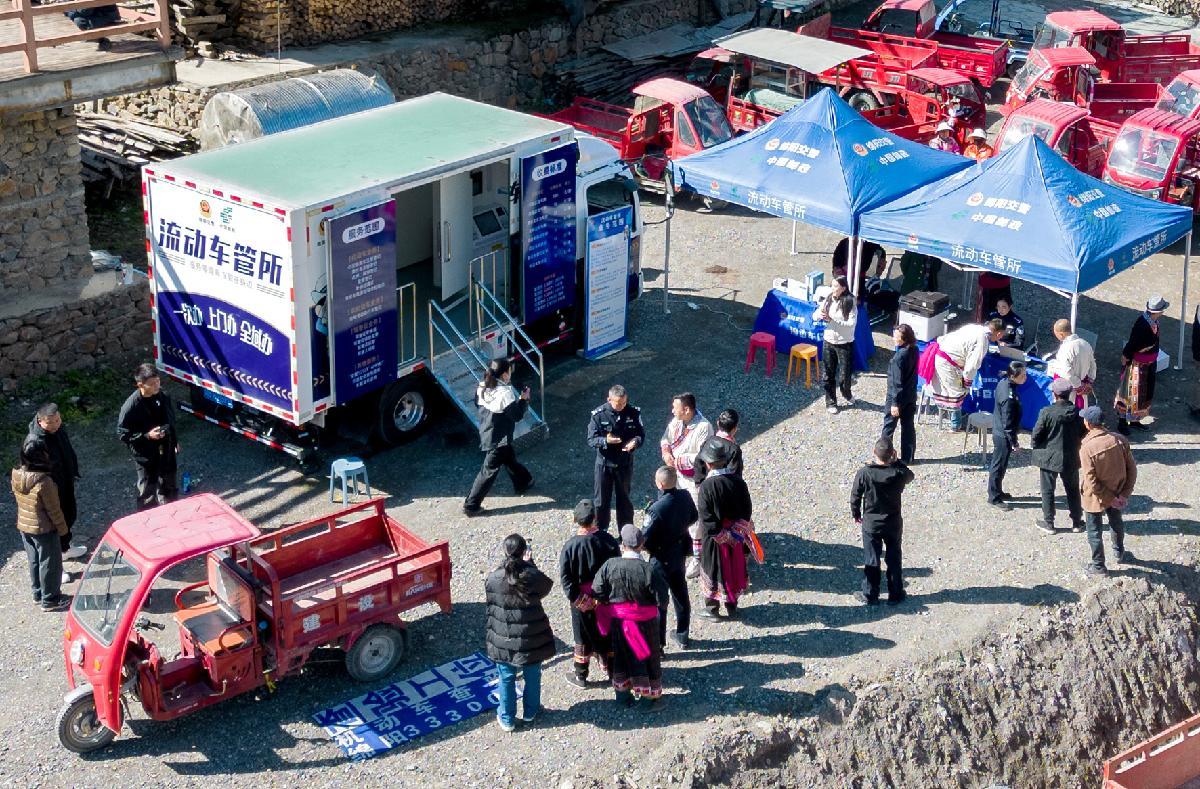 10月30日,四川省绵阳市公安局交通警察支队将“流动车管所”开进平武县白马藏族乡扒昔加古寨,为周边群众带来家门口的车驾管服务。