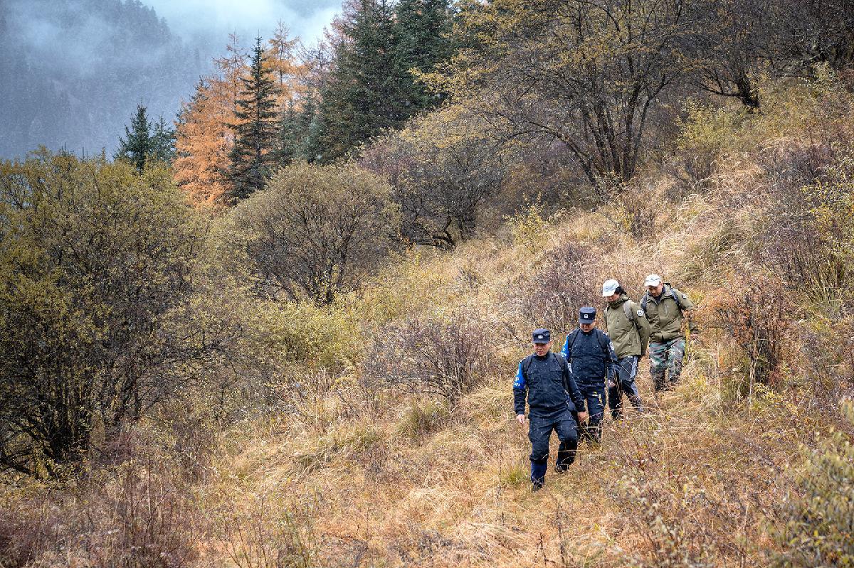 10月31日,四川省平武县公安局白马派出所民警联合护林员在大熊猫国家公园王朗片区进行巡逻。