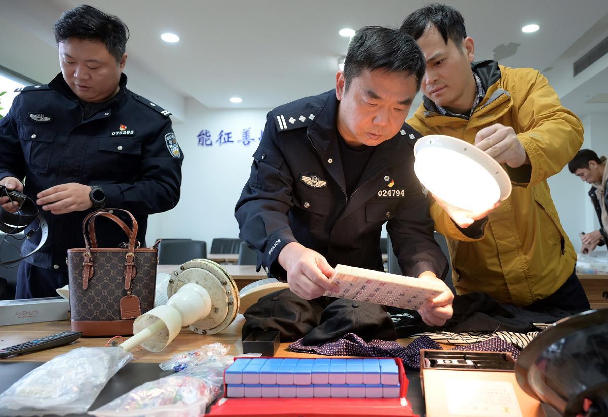 图为11月4日,刑侦大队民警清点诈赌工具。