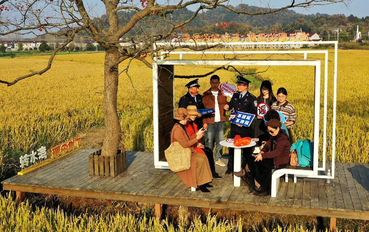11月13日,安徽省舒城县公安局网监大队联合阙店派出所走进转水湾村“稻田树下”打卡点,向游客和村民开展打击整治网络谣言宣传。