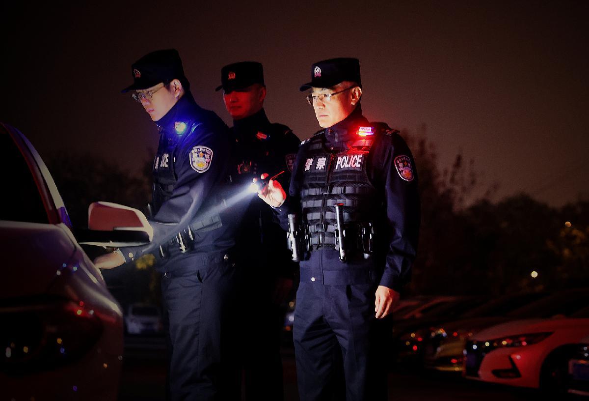 图为民辅警正在居民区进行治安巡查。
