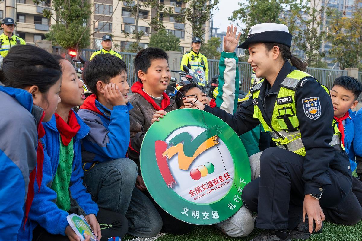 12月2日是第十四个“全国交通安全日”,贵州省赤水市公安局交警大队民警走进校园,向小朋友们普及交通安全知识。