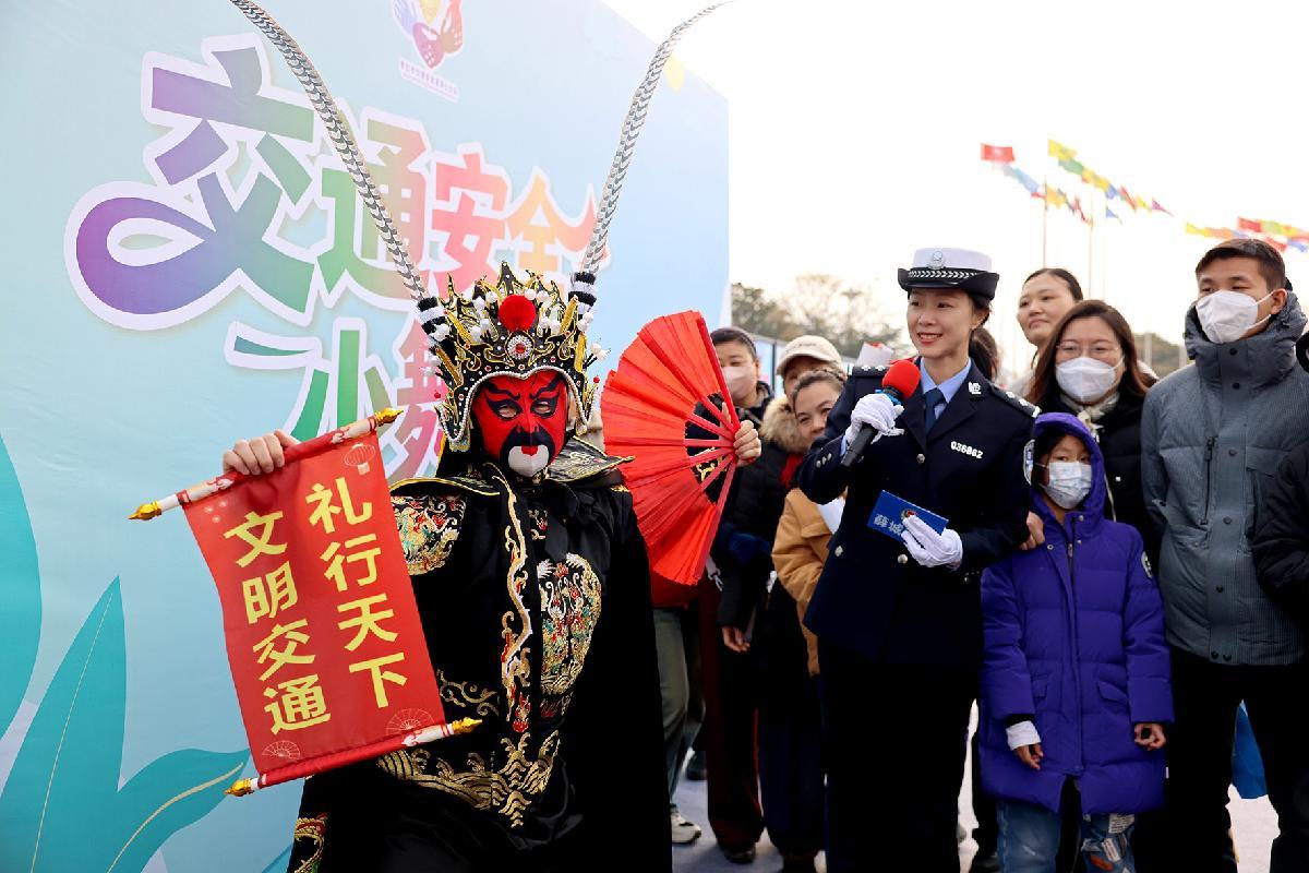 12月2日,在山东省枣庄市光明广场“交通安全小舞台”,枣庄市公安局市中分局交通管理大队民警利用传统“变脸”表演方式宣传交通安全知识。