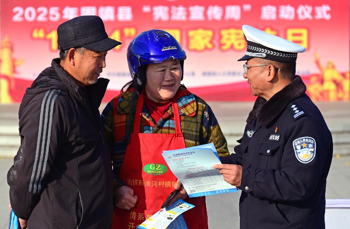 12月3日,安徽省蚌埠市固镇县公安局交管大队民警在“宪法宣传周”启动仪式现场为群众讲解交通法规。