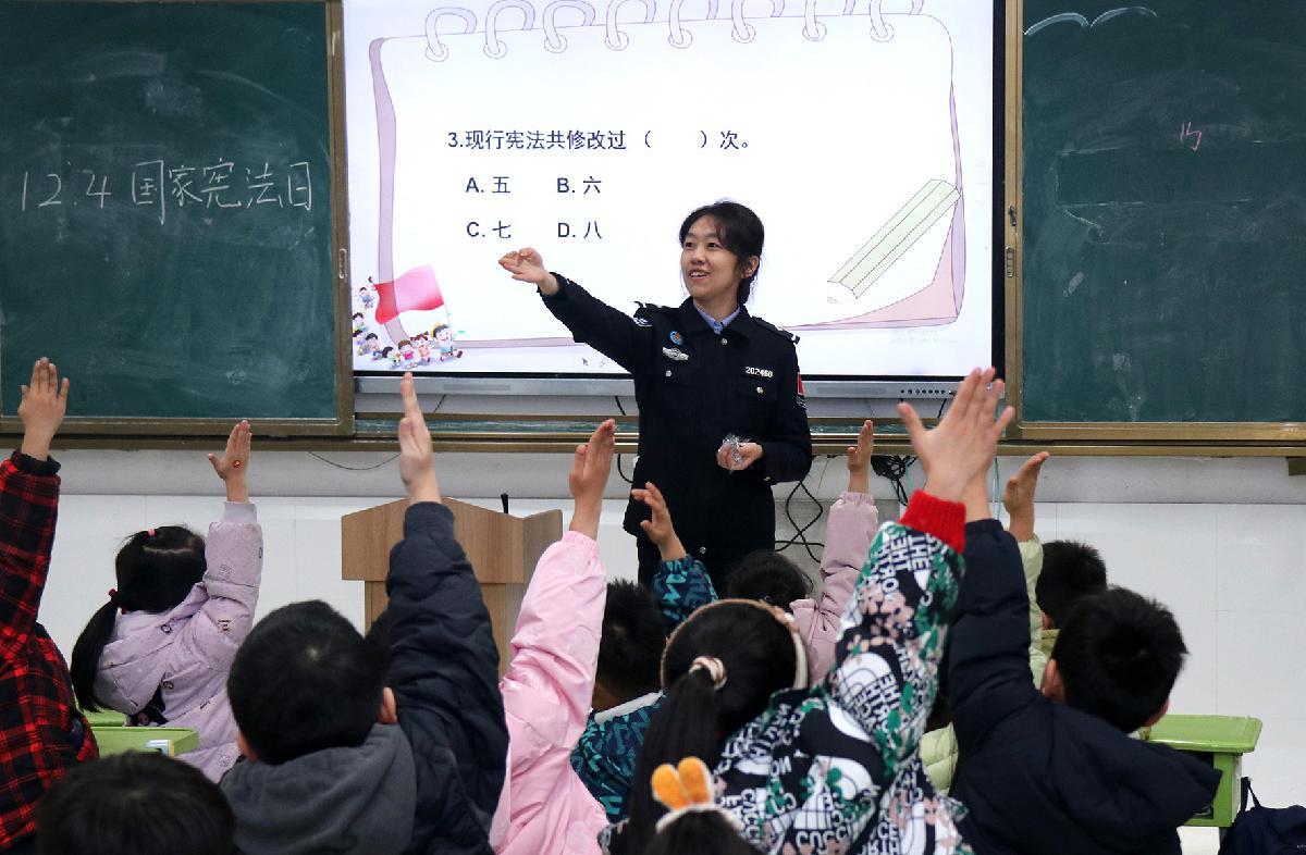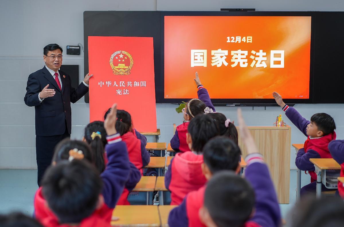 12月2日,在江苏省兴化市文峰小学,兴化市人民检察院未成年人法治宣讲团工作人员为学生们讲解宪法知识。