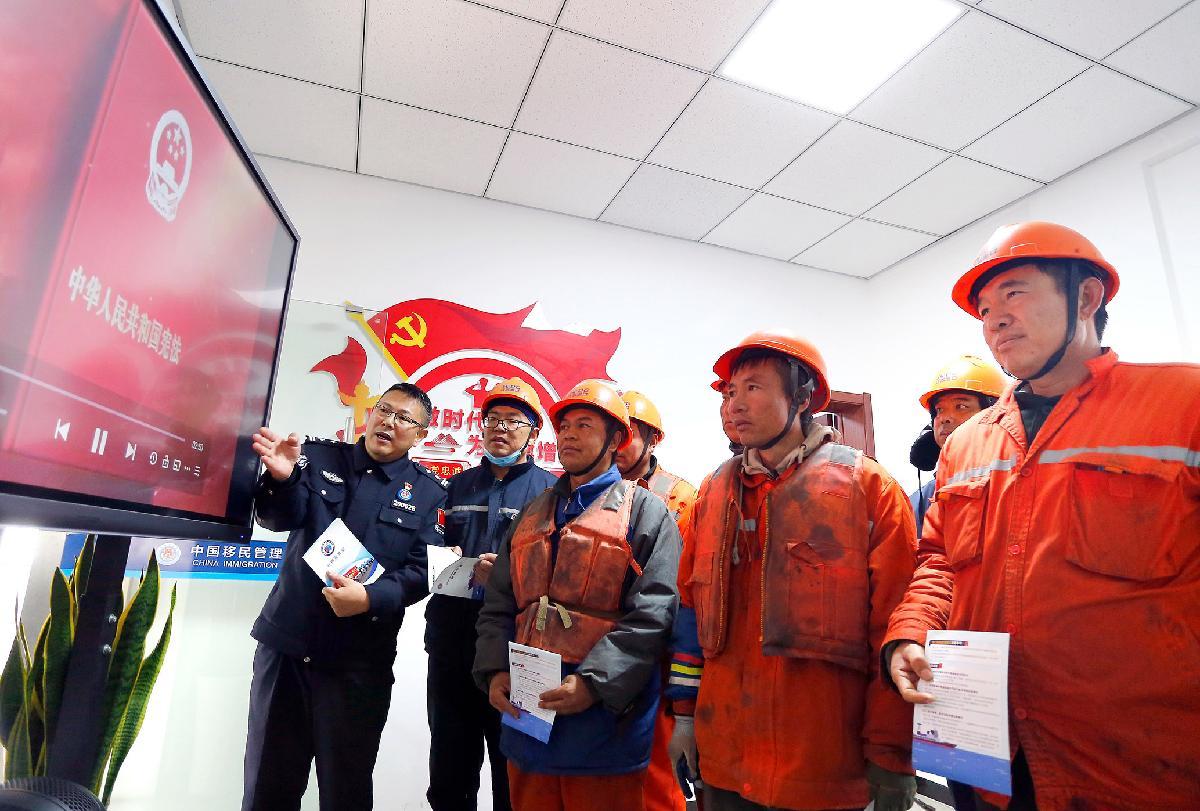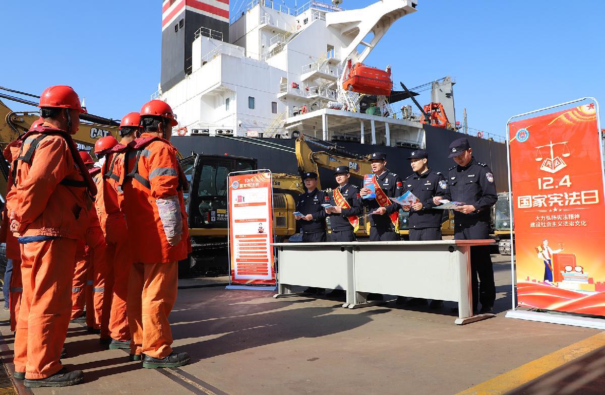 12月3日,在南京港新生圩港区,南京港出入境边防检查站执勤民警为码头工人宣讲宪法知识。