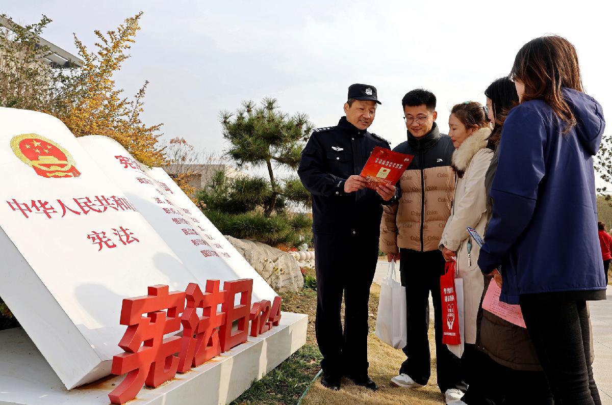 12月2日,山东省枣庄市公安局台儿庄分局民警在宪法主题公园为群众讲解宪法知识。
