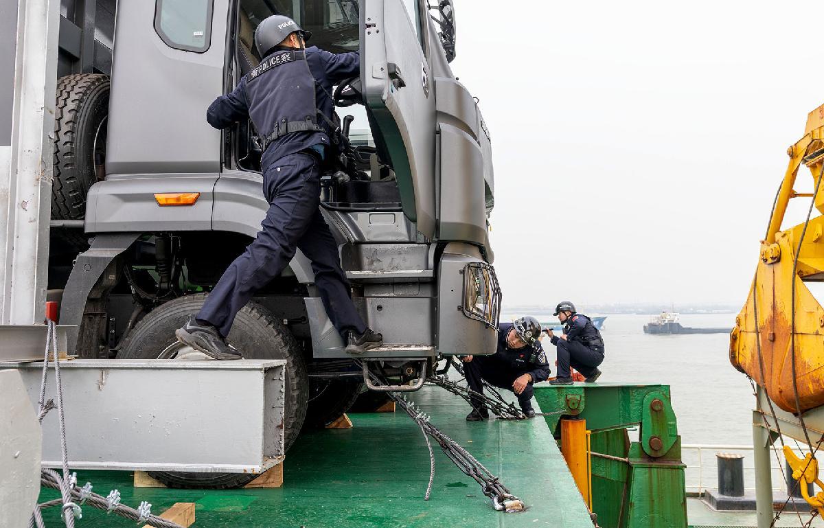 图为民警对离港船舶进行查验。