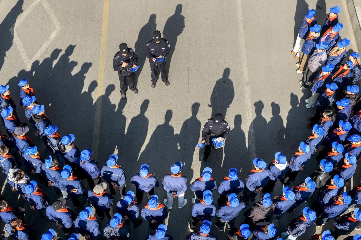 图为1月13日,民警在一家企业进行反诈、安全生产等知识宣讲。