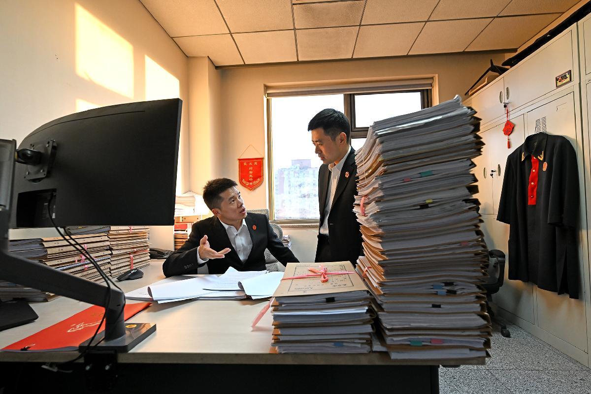 2025年12月23日,北京市朝阳区人民法院望京法庭法官助理刘柳把新收案件的卷宗材料及时分派给法官。