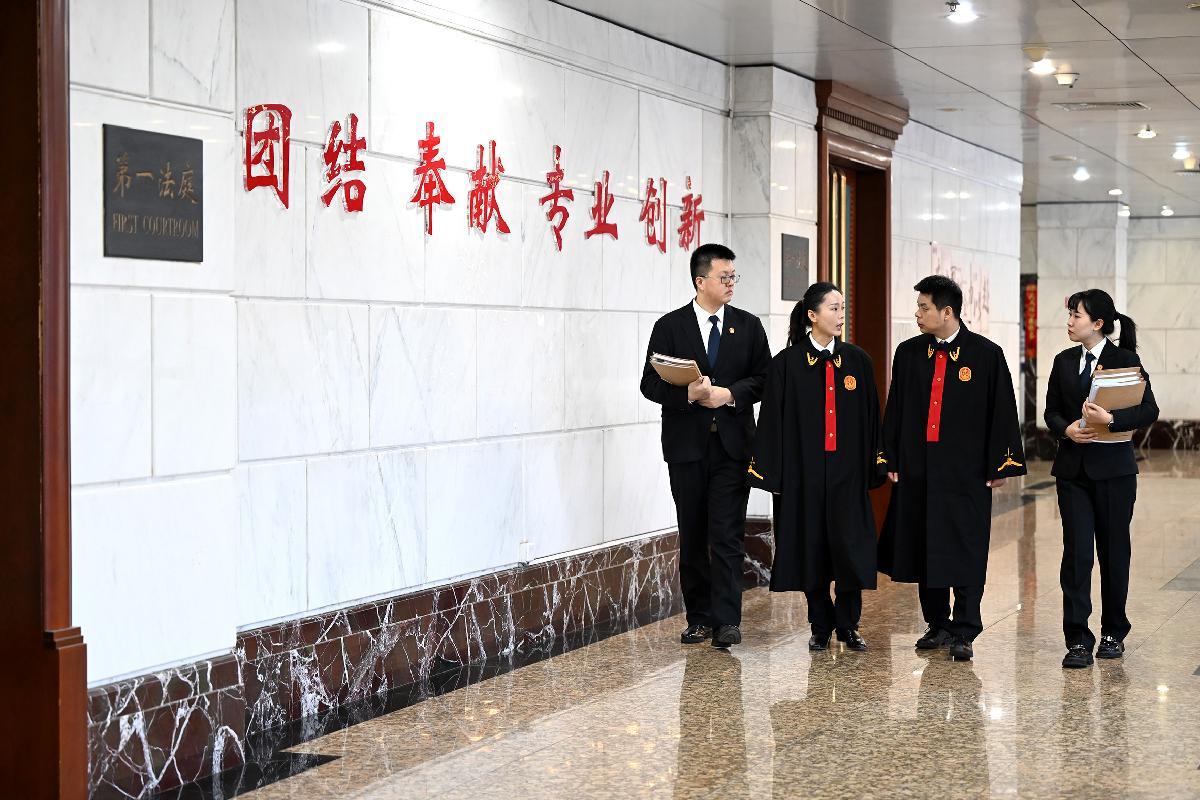 2025年12月31日,北京市朝阳区人民法院民二庭法官王菁璐(左二)与法官周剑彬(右二)在前往法庭的路上,分析案件审理思路。