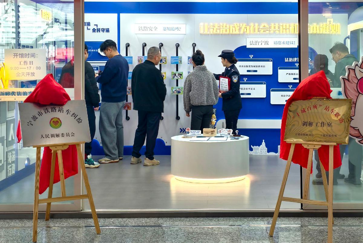 2月5日,浙江省宁波火车站“十城百所”站车联动调解工作室正式揭牌成立。工作室由宁波市调解协会、宁波站派出所联合组建,是全国首个铁路枢纽法治实践阵地的重要组成部分。