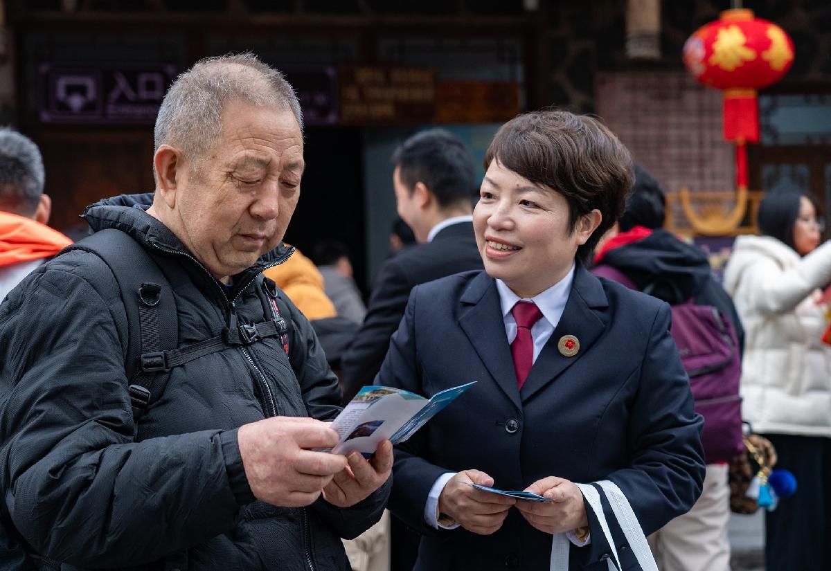 2月9日,贵州省黔东南苗族侗族自治州雷山县司法局创新普法形式,将法律知识包装成特色“年货”,组织法治宣传教育志愿者在景区开展丰富多彩的新春法治宣传。
