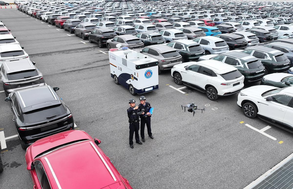 图为民警使用警用无人机和无人巡查车在码头汽车堆场巡查。