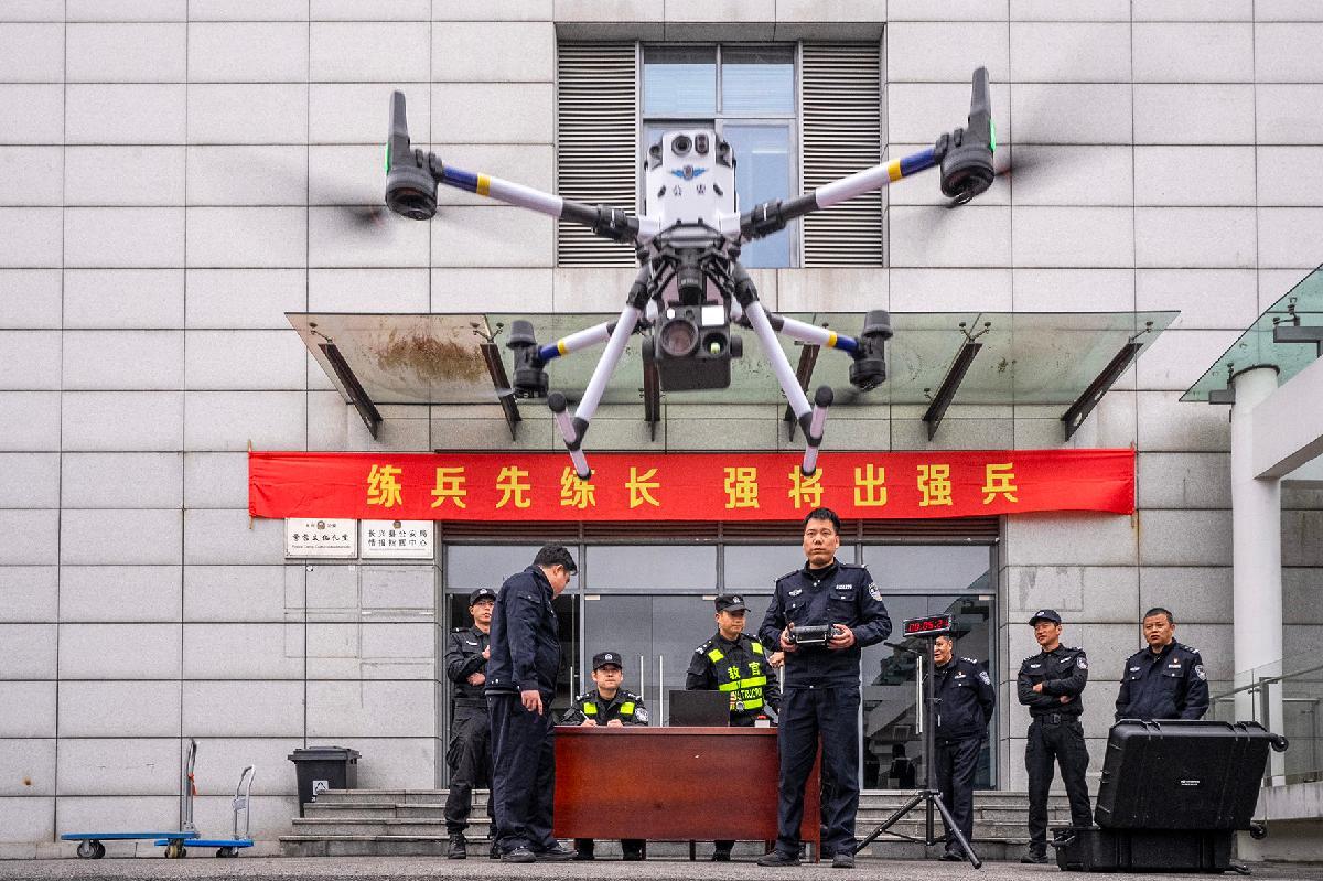 图为巡特警大队组织开展警用无人机高空侦测科目比武。
