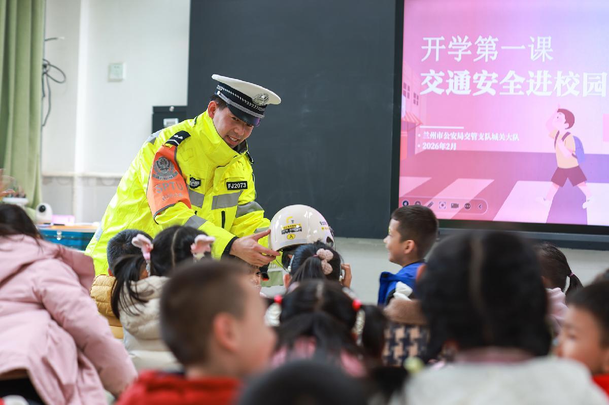 2月25日,甘肃省兰州市公安局交管支队城关大队辅警在城关区水车园小学民勤街分校,为学生们讲解交通安全知识。