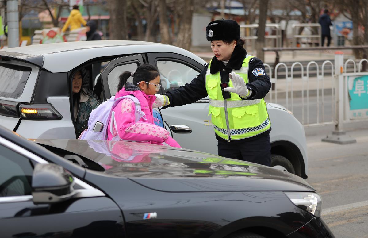 3月2日,辽宁省阜新市公安局交管支队细河大队民辅警在护学岗执勤。