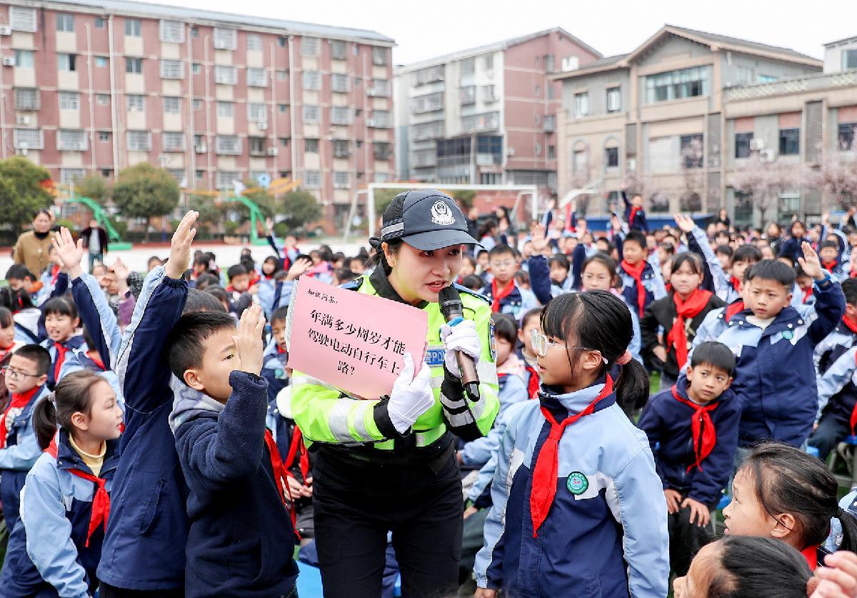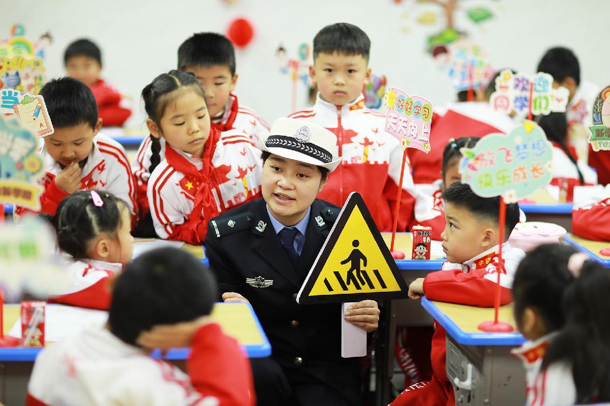3月2日,在贵州省赤水市第四小学,赤水市公安局交管大队民警给学生讲解交通安全知识。