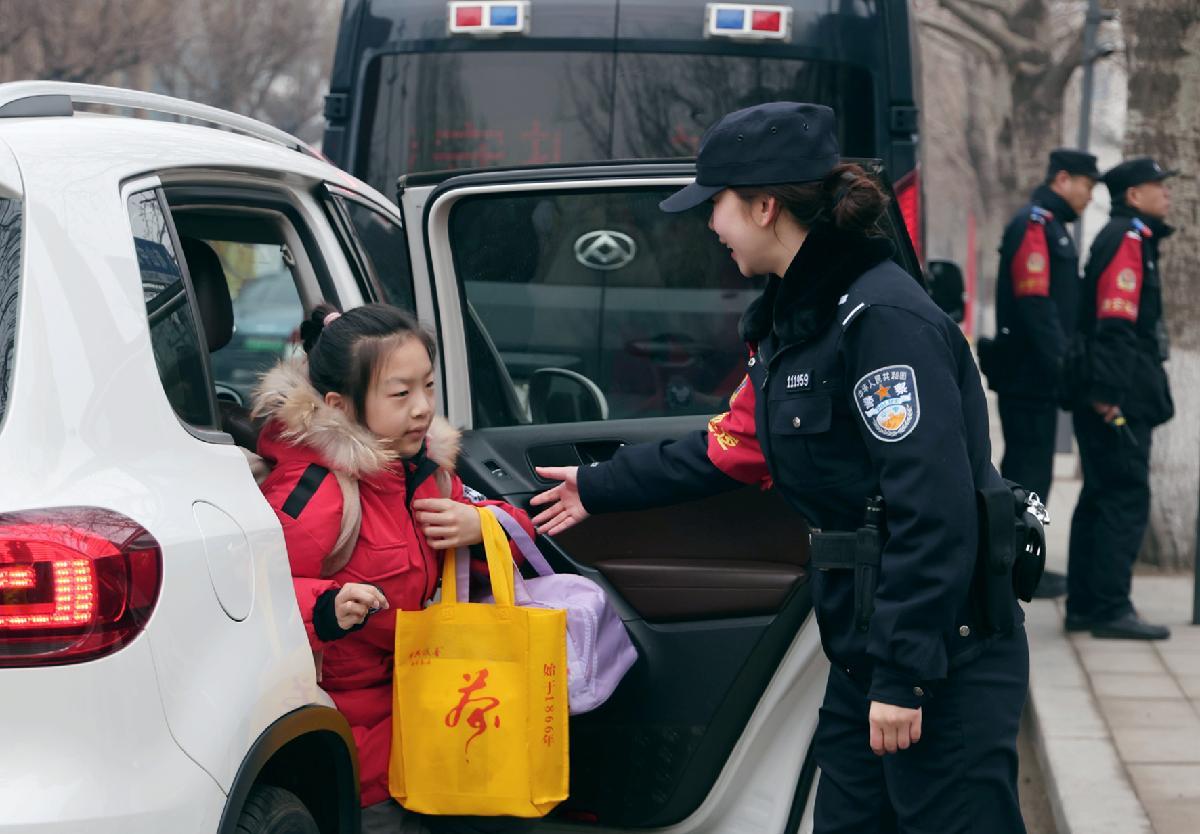 3月2日,辽宁省沈阳市中小学生迎来新学期开学第一天。沈阳市公安局皇姑分局民辅警在辖区中小学校护学岗执勤,守护学生平安入校。