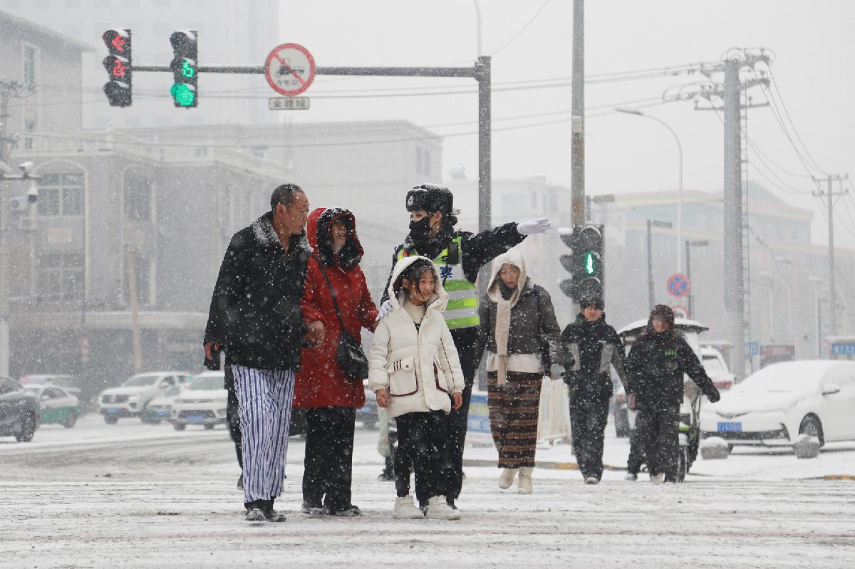 3月3日,辽宁省阜新市公安局交管支队海州大队女骑中队民辅警冒雪执勤。