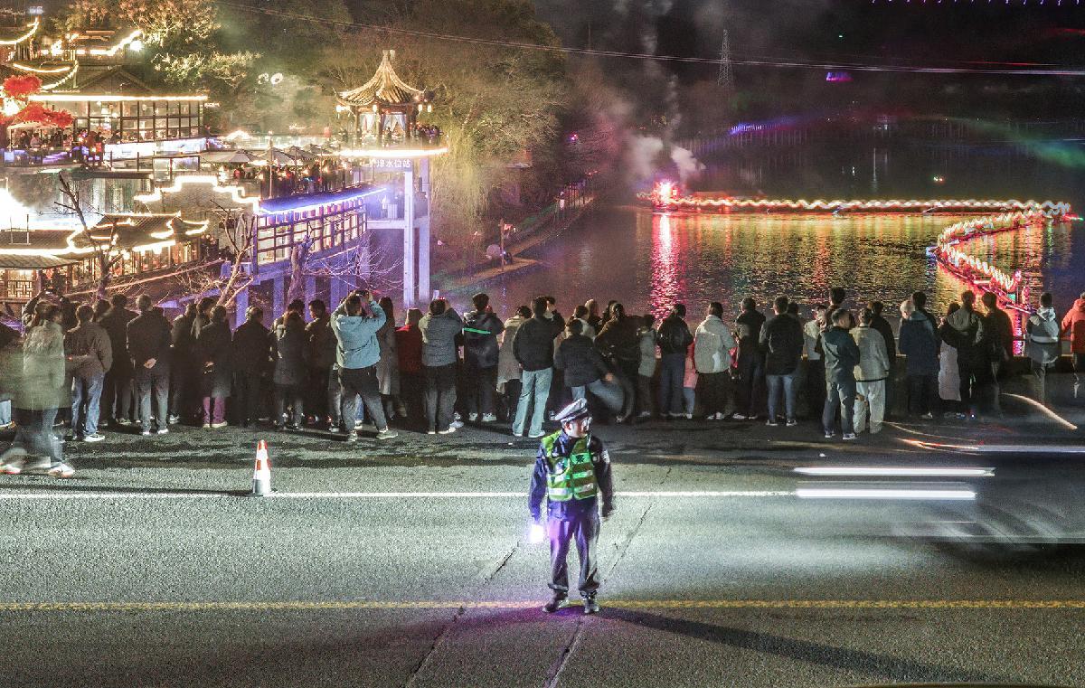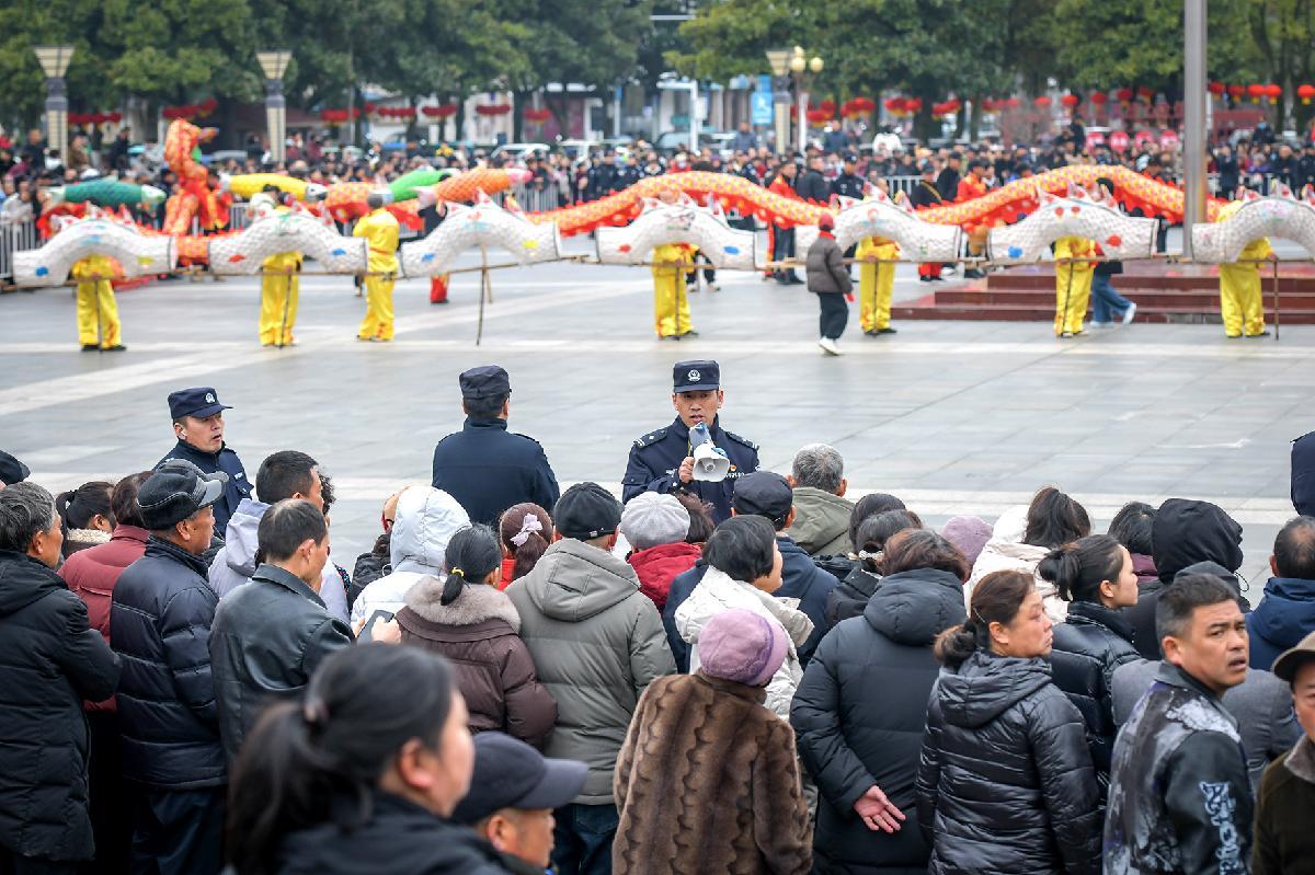 3月3日,安徽省泾县公安局民警在2026元宵民俗巡游展演活动现场维持秩序。