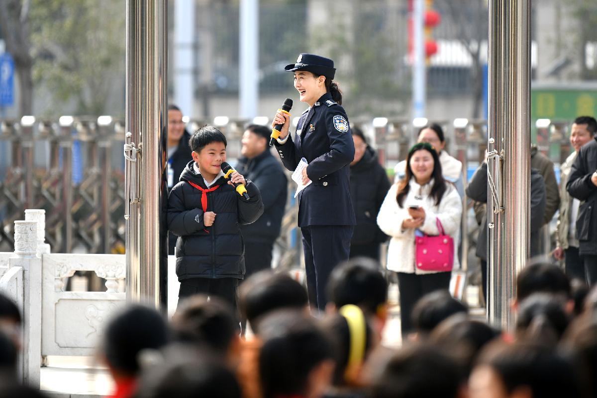 3月6日,安徽省阜南县玉泉小学法治副校长、阜南县公安局民警刘盛楠在校园为学生们宣讲安全防范知识。