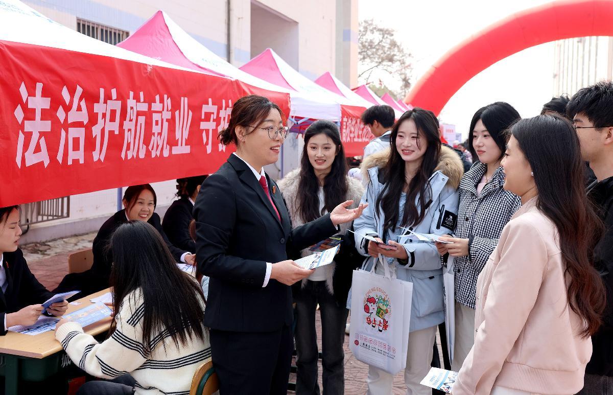 3月21日,山东省枣庄市市中区人民法院法官在枣庄学院2026年春季双选会招聘活动现场,向求职大学生们宣传劳动用工相关法律法规。