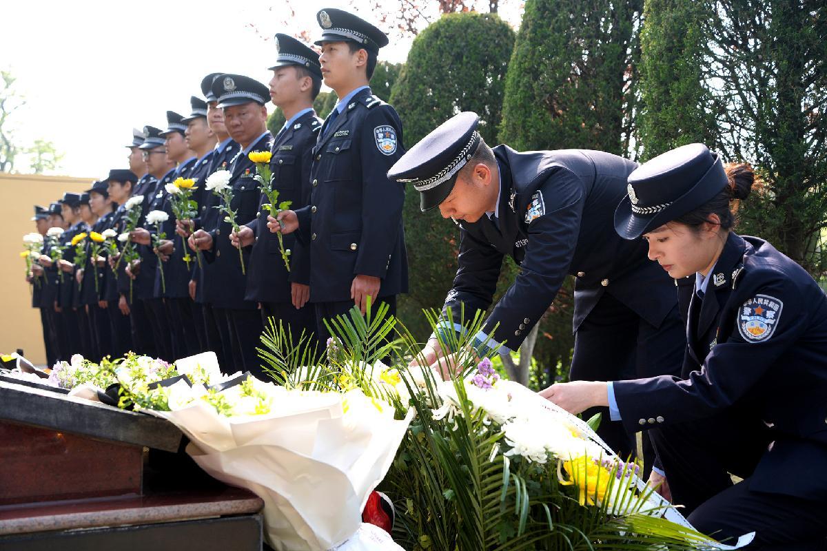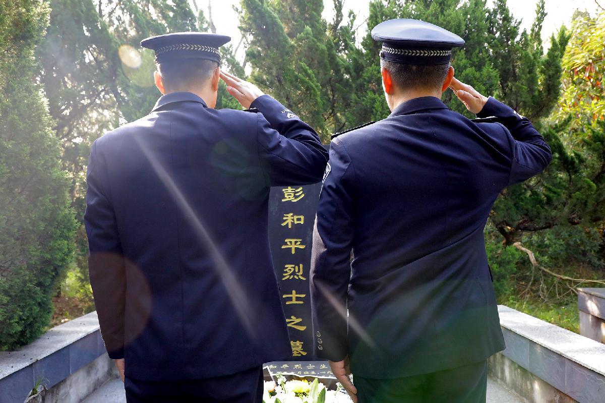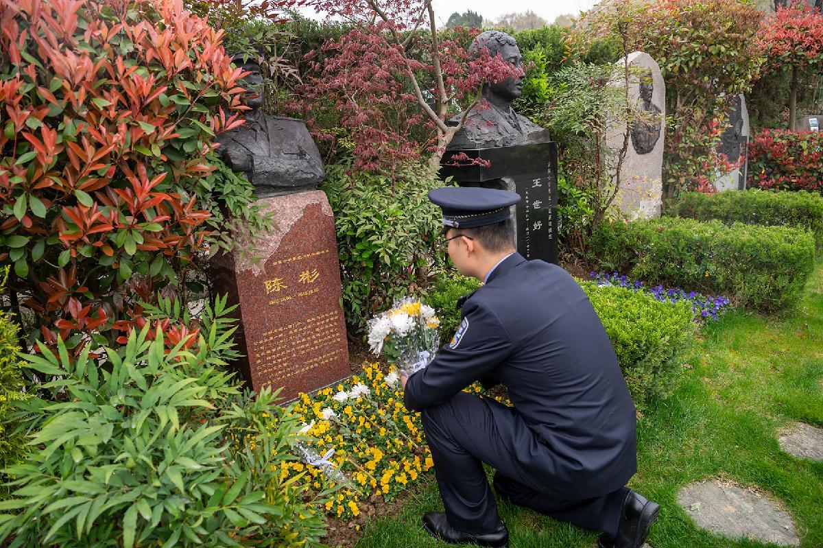 3月27日,安徽省合肥市公安局蜀山分局组织青年民警在大蜀山文化陵园开展清明祭公安英烈活动,公安英模陈彬之子、民警陈文琛祭奠父亲。