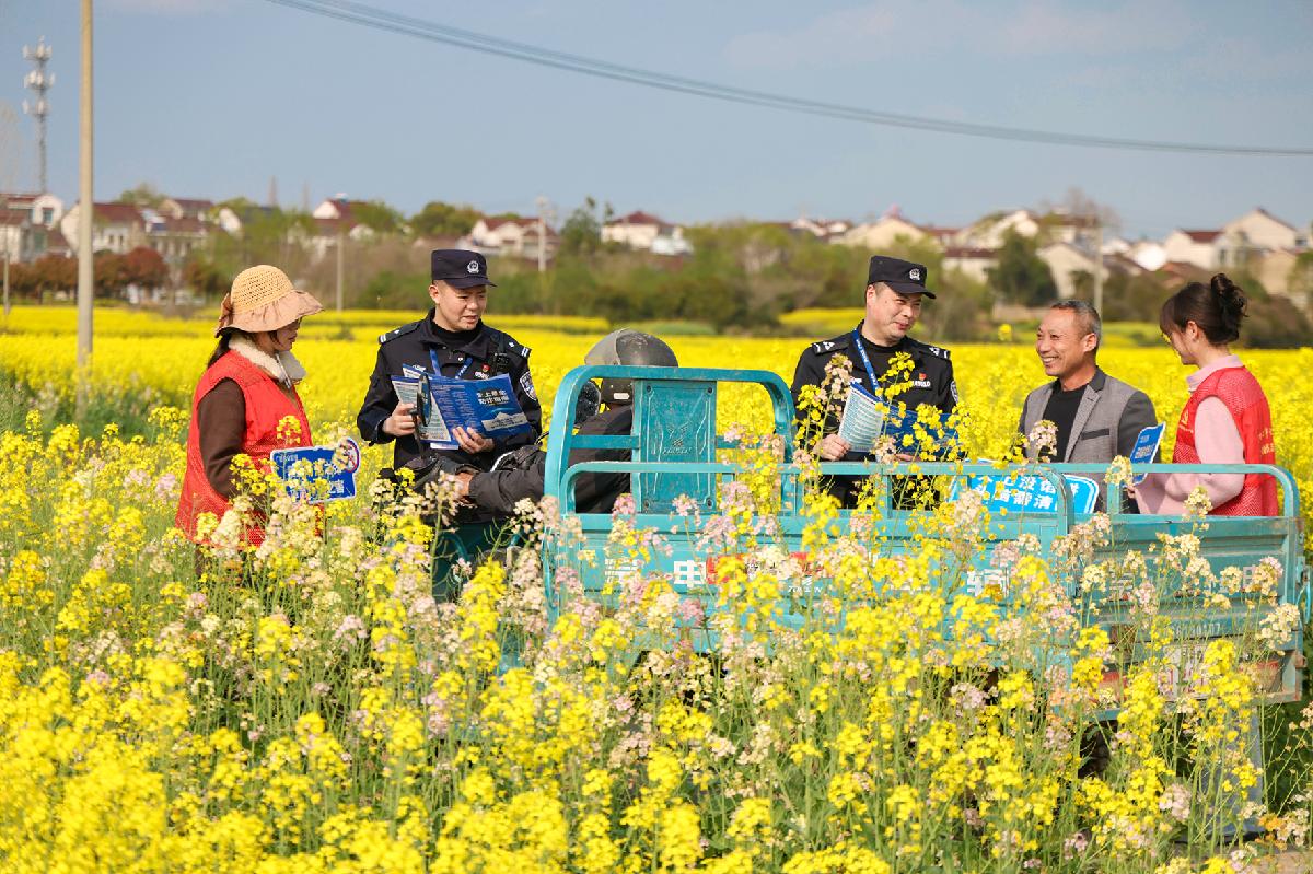 4月1日,安徽省广德市邱村派出所社区民辅警走进油菜花田,开展治安巡逻、反诈宣传。