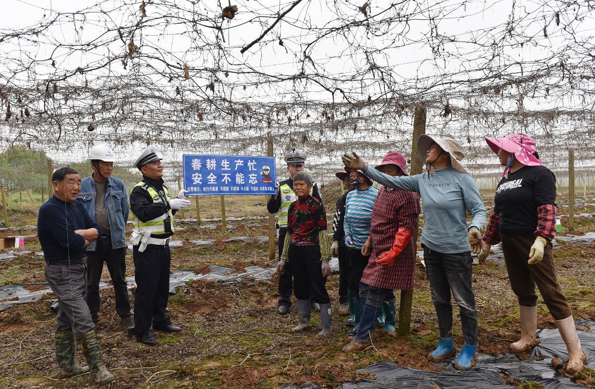4月10日,安徽省宿松县公安局交管大队民警深入公路沿线田间地头,进行春耕生产交通安全提示,守护村民出行安全。