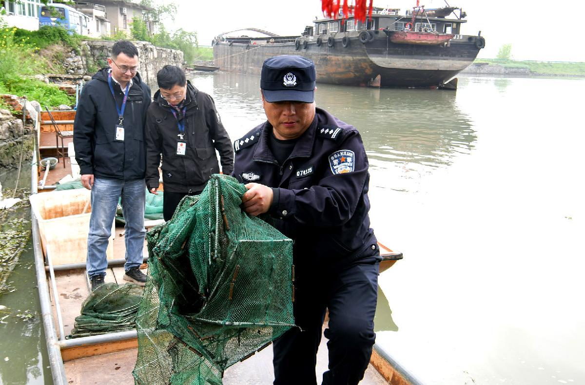 图为联合执法人员对裕溪河段打捞出的地笼网进行收缴。