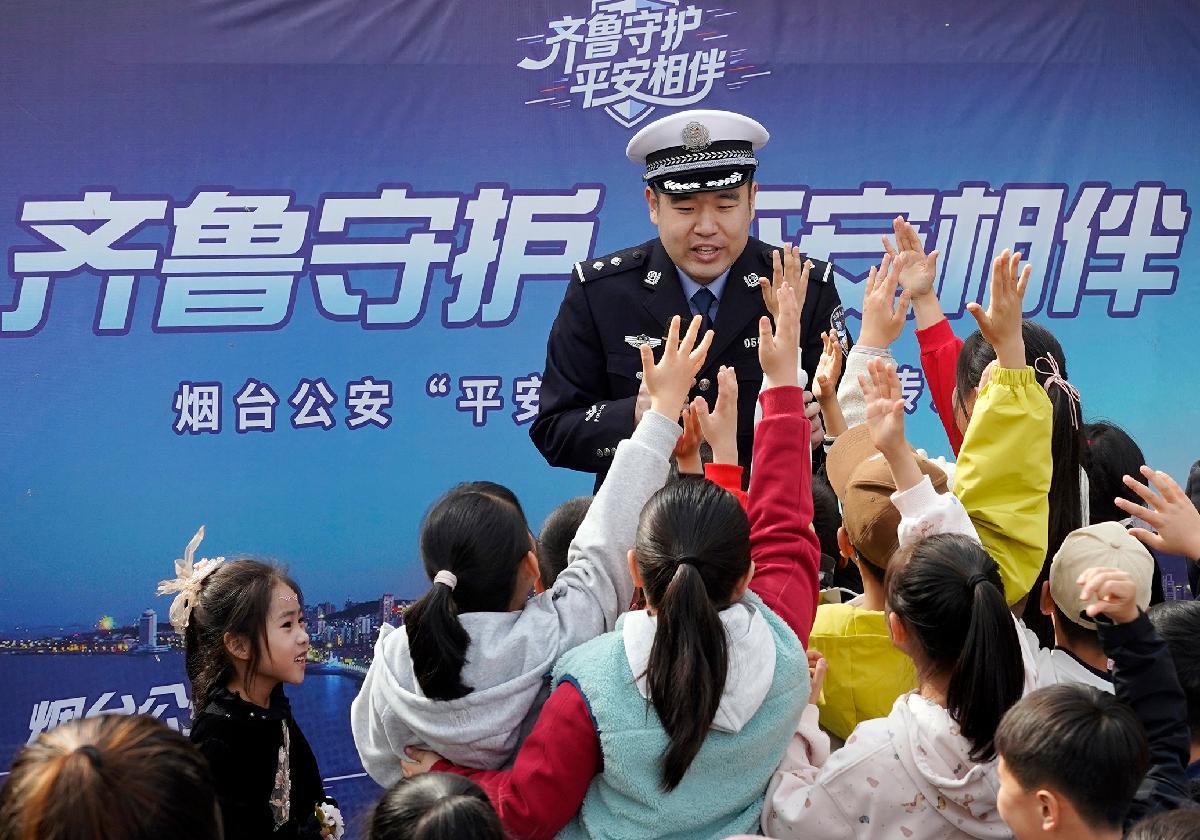 4月11日,山东省烟台市公安局在牟平区龙湖樱花大道举办“齐鲁守护·平安相伴”春日游园会,现场小朋友积极参与交通安全游戏。