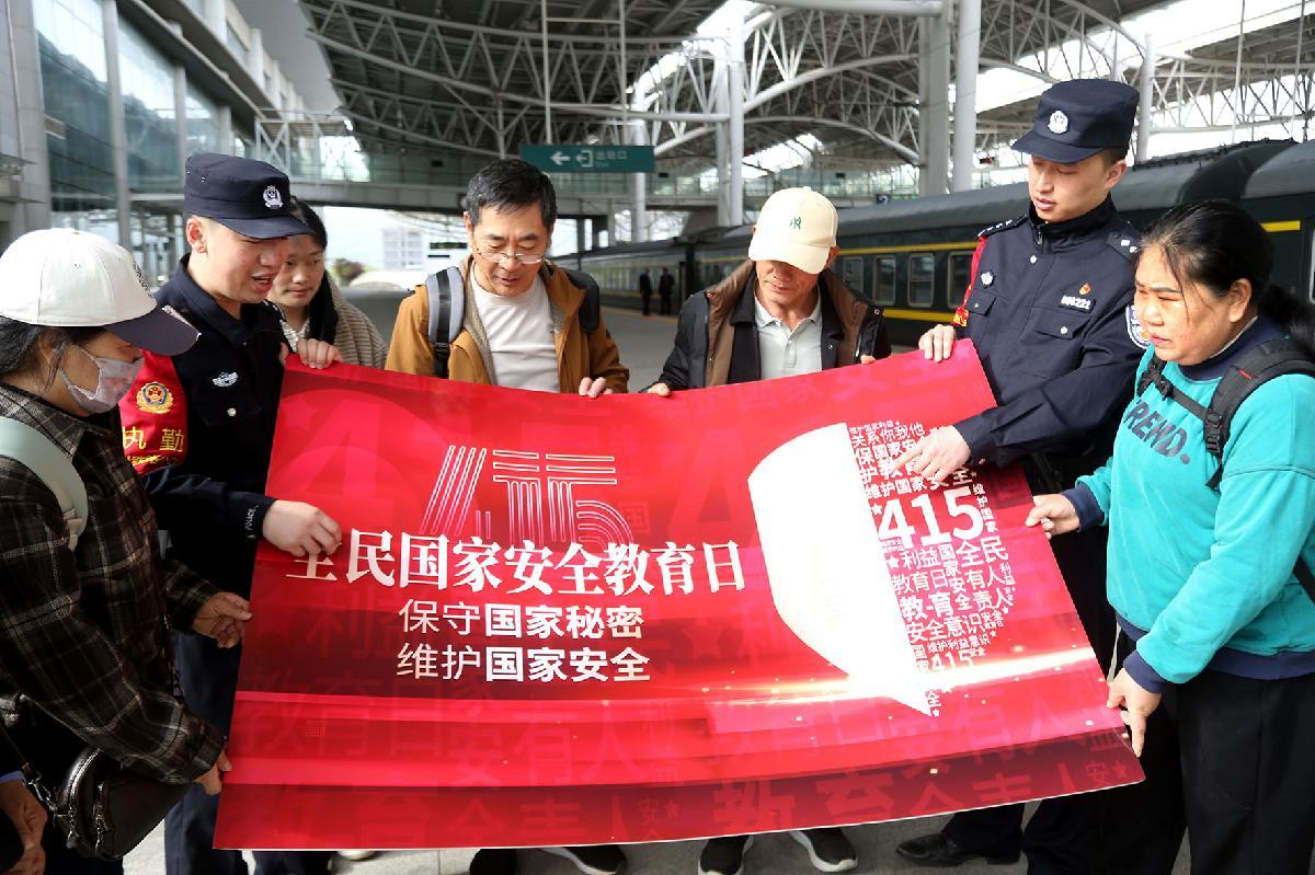 4月14日,徐州铁路公安处连云港东站派出所民警为旅客讲解国家安全知识。