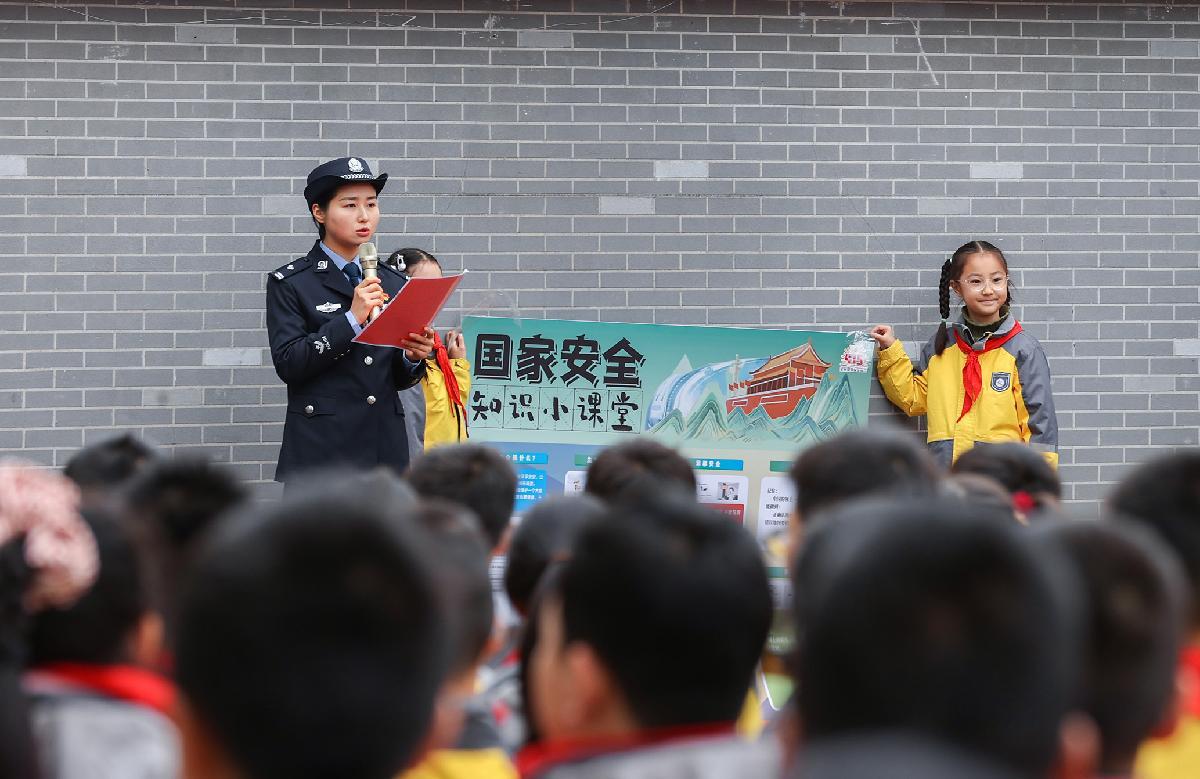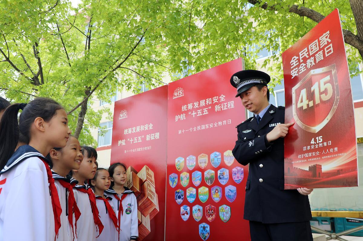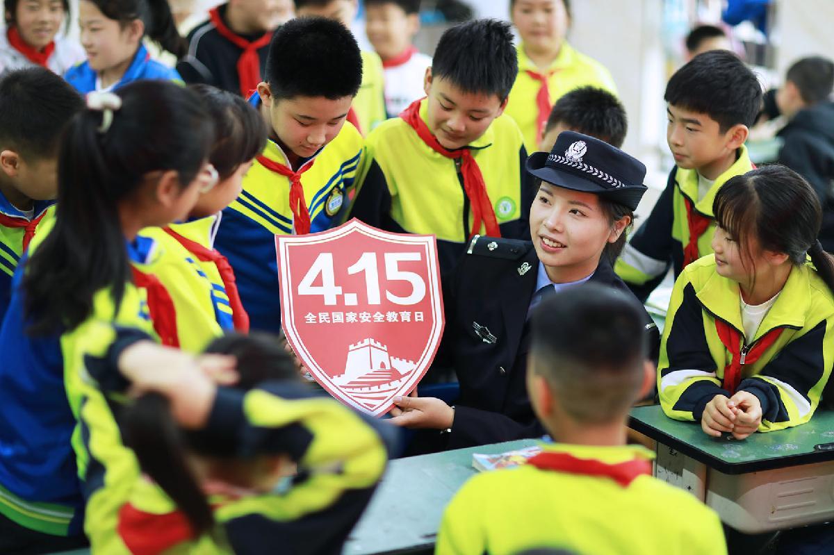 4月14日,在山东省滨州市博兴县第一小学,博兴县公安局民警为小学生普及国家安全相关知识。