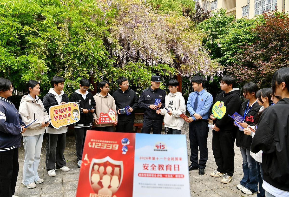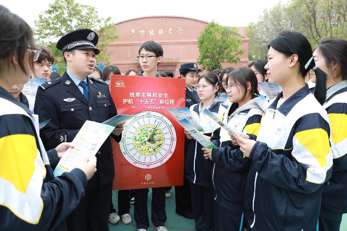 4月13日,陕西省富平县公安局城关派出所民警辅警通过展板向蓝光中学学生宣传国家安全相关法律法规知识。