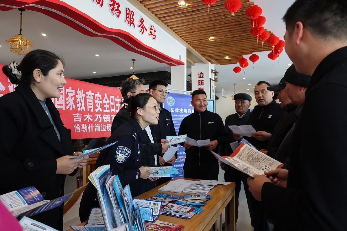 4月13日,新疆阿勒泰边境管理支队恰勒什海边境派出所联合吉木乃镇政府走进萨尔乌楞边境第一村,开展全民国家安全教育日宣传。