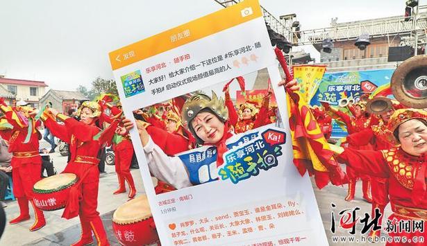 在“乐享河北随手拍”活动现场,演员展示活动宣传牌,邀请公众参与。