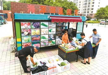 6月28日,河北省永清县御景湾社区居民在便民“直超车”购买新鲜果蔬。