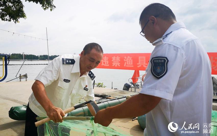 昆明市滇池管理局渔业行政执法处工作人员正在销毁收缴的违禁渔具。(人民网 虎遵会 摄)