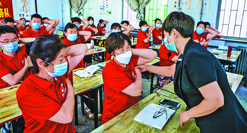 山西省万荣县人社部门采取在全县多点讲课的办法,免费对城镇失业人员和农村进城务工人员进行“万荣人”劳务品牌相关培训,助他们掌握一技之长,凭结业证上岗就业。图为近日,在万荣县齐家职业培训学校,保健按摩老师在手把手教学员寻找人体穴位。李克荣