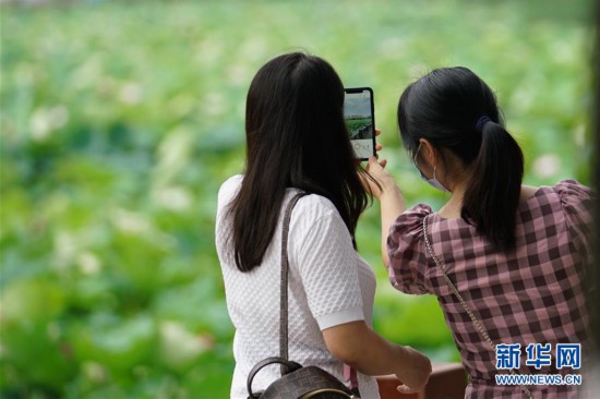 8月11日,游人在武汉东湖风景区拍照游览。 新华社记者 冯国栋 摄
