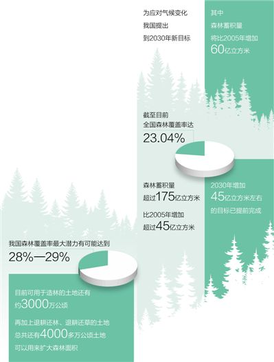 近年来,我国开展大规模国土绿化行动,全面保护天然林,扩大退耕还林还草规模。截至目前,全国森林覆盖率达23.04%,森林蓄积量超过175亿立方米,比2005年增加超过45亿立方米。“森林蓄积量已超额完成2020年目标,2030年增加45亿立方米左右的目标也已提前完成。”张国斌介绍。