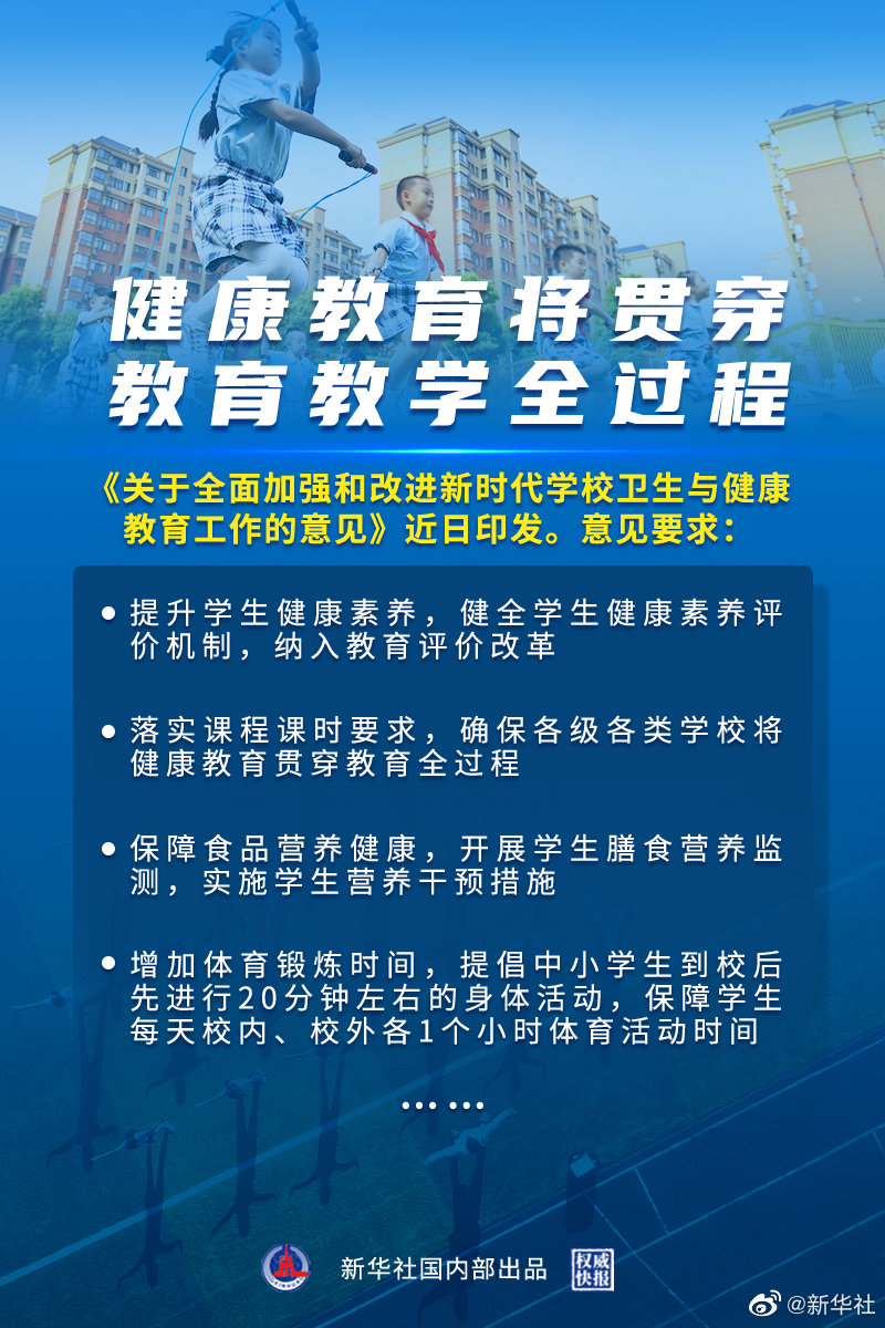 记者3日从教育部新闻发布会获悉,《关于全面加强和改进新时代学校卫生与健康教育工作的意见》近日印发。意见要求,将健康教育与德育、智育、体育、美育、劳动教育相结合,融入教育教学、管理服务全过程。①提升学生健康素养,健全学生健康素养评价机制,纳入教育评价改革。②明确健康教育内容。③落实课程课时要求,确保各级各类学校将健康教育贯穿教育全过程。④拓展健康教育渠道。⑤保障食品营养健康,开展学生膳食营养监测,实施学生营养干预措施。⑥增加体育锻炼时间,提倡中小学生到校后先进行20分钟左右的身体活动,保障学生每天校内、校外各1个小时体育活动时间。⑦强化心理健康教育。⑧养成健康行为习惯。(记者胡浩,海报设计杨轶群)
