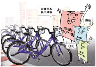 事实上,即使是没有违法内容的小广告,如“租房信息”“办理刻章”等,同样不可以随意张贴在共享单车上。