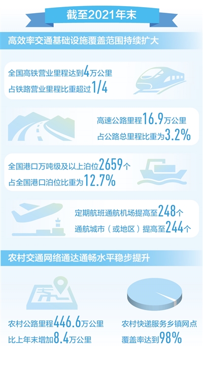 高效率交通基础设施覆盖范围持续扩大。截至2021年末,全国高铁营业里程达到4万公里,占铁路营业里程比重超过1/4。高速公路里程16.9万公里,比上年末增加8090公里,占公路总里程比重为3.2%,呈现稳步提高态势。全国港口万吨级及以上泊位2659个、增加67个,占全国港口泊位比重为12.7%、提高1个百分点。定期航班通航机场、通航城市(或地区)分别提高至248个和244个。